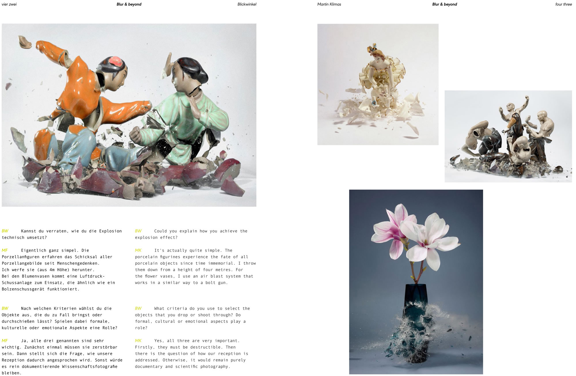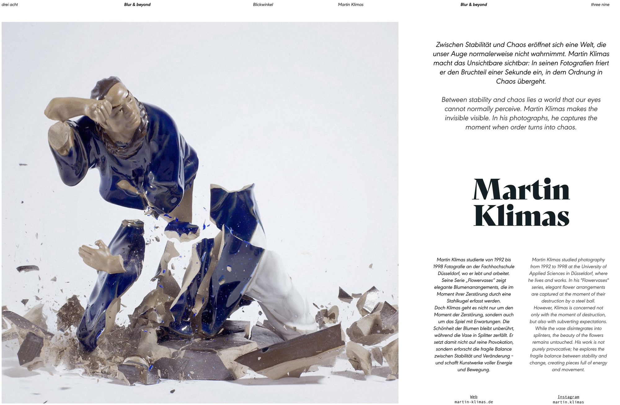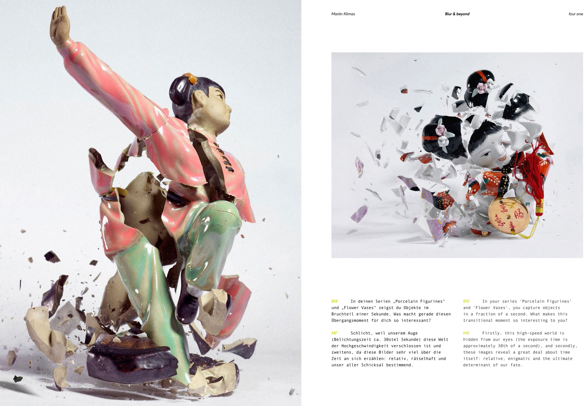 Like a 3-D take on Jackson Pollock, the latest work by the artist Martin Klimas begins with splatters of paint in fuchsia, teal and lime green, positioned on a scrim over the diaphragm of a speaker. Then the volume is turned up. For each image, Klimas selects music — typically something dynamic and percussive, like Karlheinz Stockhausen, Miles Davis or Kraftwerk — and the vibration of the speaker sends the paint aloft in patterns that reveal themselves through the lens of his Hasselblad. Klimas rose to prominence in the art world four years ago for a series of photos that captured porcelain figurines just as they shattered. For this series, Klimas spent six months and about 1,000 shots to produce the final images from his studio in Düsseldorf, Germany. In addition to the obvious debt owed to abstract expressionism, Klimas says his major influence was Hans Jenny, the father of cymatics, the study of wave phenomena. The resulting images are Klimas’s attempt to answer the question “What does music look like?”